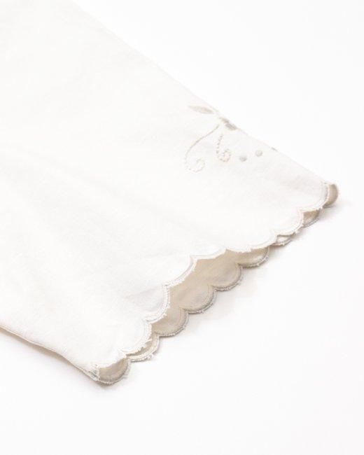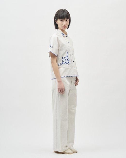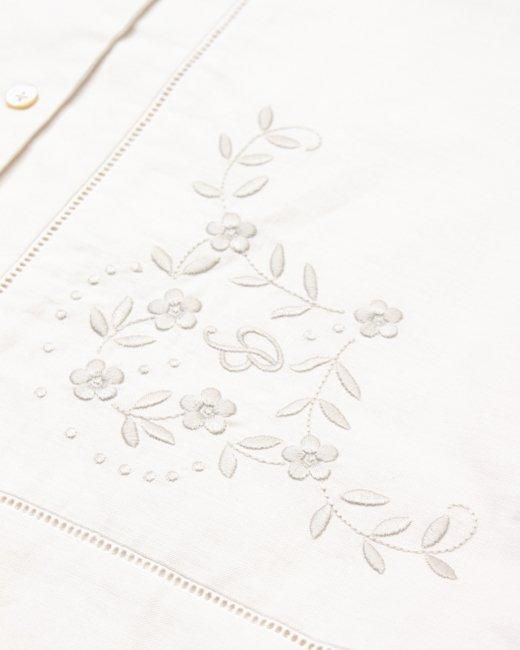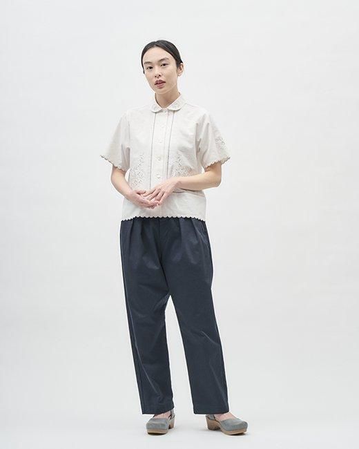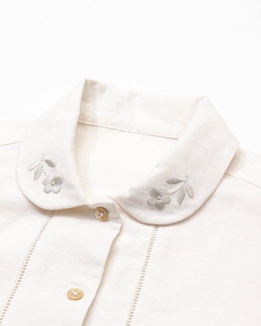 裾、袖口に刺繍と同色のカットワークを施した丸襟シャツです。