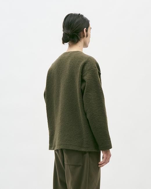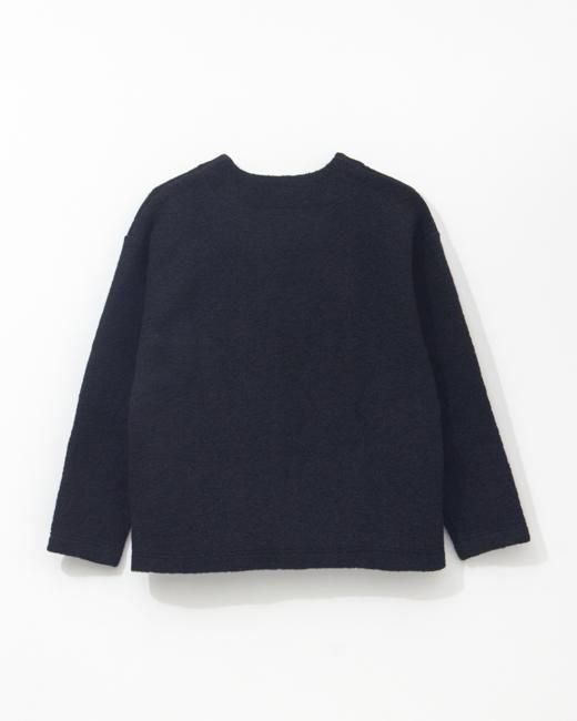 ウール混ポリエステルのスラーバーニットです。高い保温性と軽量かつふわりと優しい肌触りが特徴です。